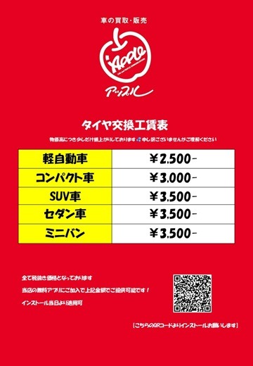 お車のご相談・ 査定だけでもOK! カンタン 入力 30秒 アップルがブランド買取始めました! お電話でも受付中! 受付時間10:00 ~ 18:00 0120-88-1717 お車のご相談・ 査定だけでもOK! カンタン 入力 30秒 アップルがブランド買取始めました! お電話でも受付中! 受付時間10:00 ~ 18:00 0120-88-1717 アップルがブランド買取始めました! お電話でも受付中! 受付時間10:00 ~ 18:00 0120-88-1717 店舗情報 在庫車 スタッフ紹介 ブログ お客様の声 キャンペーン 無料査定 click [ 未分類 ] 2025/10/28 (火) 13:35 今年2回目 こんにちは~!ついに雪の季節がやってきましたね⛄⛄実は手稲では今年2回目って知ってました??数日前にあられが降ったんです!!🫢🧐ってなことはさて置き、タイヤ交換の時期でもありますね!当店もありがたい事に土日のご予約が少なめとなっておりますので当店でご予約ご希望に方はお早めにご予約ください!!※税抜き価格※アプリにご登録で工賃表と同じ価格となりますので是非ご加入ください(^▽^)/ではまた!🫡🫡⭐ 2025-10-28 13:35:15 新しい記事へ 古い記事へ 最新記事 今年2回目時間ができたら。当店の2階。お久しぶりでした!GW休業日 店舗情報に戻る 月別アーカイブ 2025年10月(1)2025年09月(2)2025年07月(1)2025年05月(1)2025年02月(1)2025年01月(1)2024年12月(3)2024年11月(2)2024年10月(1)2024年09月(4)2024年08月(5)2024年07月(2)2024年05月(1)2024年04月(1)2024年03月(3)2024年02月(1)2024年01月(1)2023年12月(3)2023年11月(1)2023年10月(2)2023年09月(1)2023年08月(4)2023年07月(2)2023年05月(1)2023年04月(3)2023年03月(3)2023年02月(3)2023年01月(3)2022年12月(2)2022年11月(4)2022年10月(6)2022年09月(7)2022年08月(5)2022年07月(8)2022年06月(7)2022年05月(6)2022年04月(7)2022年03月(8)2022年02月(9)2022年01月(9)2021年12月(14)2021年11月(16)2021年10月(14)2021年09月(16)2021年08月(8)2021年07月(17)2021年06月(15)2021年05月(15)2021年04月(14)2021年03月(13)2021年02月(10)2021年01月(5)2020年12月(8)2020年11月(6)2020年09月(1)2020年08月(2)2020年07月(2)2020年06月(3)2020年05月(2)2020年04月(3)2020年03月(2)2020年02月(4)2020年01月(3)2019年12月(4)2019年11月(5)2019年10月(4)2019年09月(5)2019年08月(9)2019年07月(9)2019年06月(9)2019年05月(8)2019年04月(9)2019年03月(9)2019年02月(8)2019年01月(4)2018年12月(9)2018年11月(8)2018年10月(9)2018年09月(10)2018年08月(9)2018年07月(8)2018年06月(10)2018年05月(9)2018年04月(9)2018年03月(10)2018年02月(8)2018年01月(9)2017年12月(9)2017年11月(9)2017年10月(9)2017年09月(11)2017年08月(10)2017年07月(9)2017年06月(8)2017年05月(8)2017年04月(9)2017年03月(9)2017年02月(8)2017年01月(7)2016年12月(8)2016年11月(9)2016年10月(9)2016年09月(9)2016年08月(7)2016年07月(9)2016年06月(9)2016年05月(7)2016年04月(6)2016年03月(3)2016年02月(4)2016年01月(6)2015年12月(12)2015年11月(9)2015年10月(10)2015年09月(9)2015年08月(10)