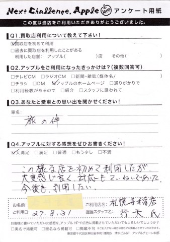 お車のご相談・ 査定だけでもOK! カンタン 入力 30秒 アップルがブランド買取始めました! お電話でも受付中! 受付時間10:00 ~ 18:00 0120-88-1717 お車のご相談・ 査定だけでもOK! カンタン 入力 30秒 アップルがブランド買取始めました! お電話でも受付中! 受付時間10:00 ~ 18:00 0120-88-1717 アップルがブランド買取始めました! お電話でも受付中! 受付時間10:00 ~ 18:00 0120-88-1717 店舗情報 在庫車 スタッフ紹介 ブログ お客様の声 キャンペーン 無料査定 click お客様の声 ご記入日: 2015/11/11 新十津川町 I様 <Q愛車との思い出をお聞かせください!> 旅の件<Qアップルに対する感想をぜひお書きください!> この様な店を初めて利用したが、大変感じ良く対応もていねいでした。今後も利用したい。 前へ 次へ お客様の声一覧を見る