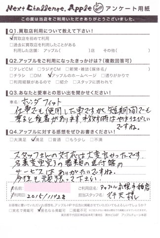 スタッフさんの対応は大変良かったです。名義変更完了の書類等のサービスはありがたいですね。今後も頑張ってください。