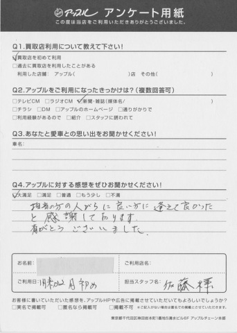 お車のご相談・ 査定だけでもOK! カンタン 入力 30秒 アップルがブランド買取始めました! お電話でも受付中! 受付時間10:00 ~ 18:00 0120-88-1717 お車のご相談・ 査定だけでもOK! カンタン 入力 30秒 アップルがブランド買取始めました! お電話でも受付中! 受付時間10:00 ~ 18:00 0120-88-1717 アップルがブランド買取始めました! お電話でも受付中! 受付時間10:00 ~ 18:00 0120-88-1717 店舗情報 在庫車 スタッフ紹介 ブログ お客様の声 キャンペーン 無料査定 click お客様の声 ご記入日: 2016/07/13 札幌市 西区 K様 <Qアップルに対する感想をぜひお聞かせください!>担当の方の人柄に良い方に逢えてよかったと感謝しております。ありがとうございました。担当 佐藤 前へ 次へ お客様の声一覧を見る
