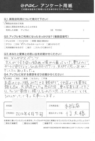 お店のスタッフ様みなさま親切で、他店よりも買取額も高く大満足でした。売却後、車の写真を送ってくださり、ちょうど最後に撮り忘れたと思っていたのでうれしかったです。大事にします。