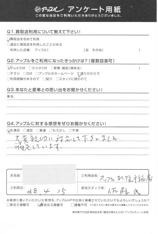 お車のご相談・ 査定だけでもOK! カンタン 入力 30秒 アップルがブランド買取始めました! お電話でも受付中! 受付時間10:00 ~ 18:00 0120-88-1717 お車のご相談・ 査定だけでもOK! カンタン 入力 30秒 アップルがブランド買取始めました! お電話でも受付中! 受付時間10:00 ~ 18:00 0120-88-1717 アップルがブランド買取始めました! お電話でも受付中! 受付時間10:00 ~ 18:00 0120-88-1717 店舗情報 在庫車 スタッフ紹介 ブログ お客様の声 キャンペーン 無料査定 click お客様の声 ご記入日: 2016/08/19 札幌市 手稲区 K様 <Qアップルに対する感想をぜひお聞かせください!>大変親切に対応してくださいました。満足しています。担当スタッフ 佐藤 前へ 次へ お客様の声一覧を見る