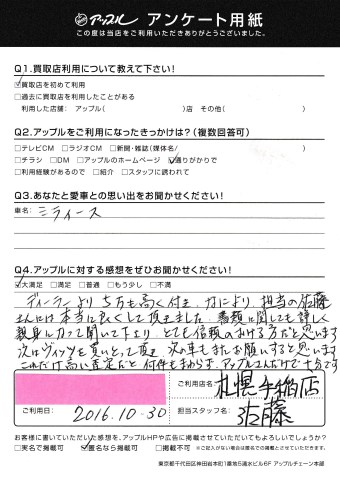 ディーラーより5万も高くつき、なにより担当の佐藤さんには本当に良くして頂きました。書類に関しても詳しく親身になって聞いてくださりとても信頼のおける方だと思います。次はヴィッツを買い取って頂き次の車もまたお願いすると思います。これだけ高い査定だと何件も回らずアップルさんだけで十分です。