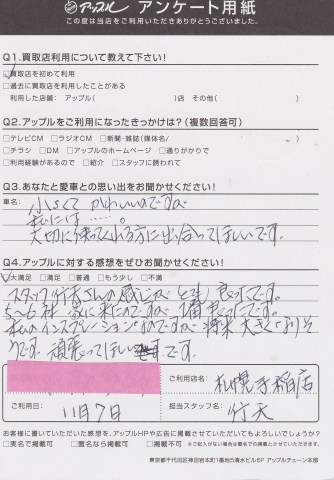 この度は当店をご利用頂きありがとうございました。車の話以外に私自身の相談ごとも聞いていただき、すごく嬉しかったです。