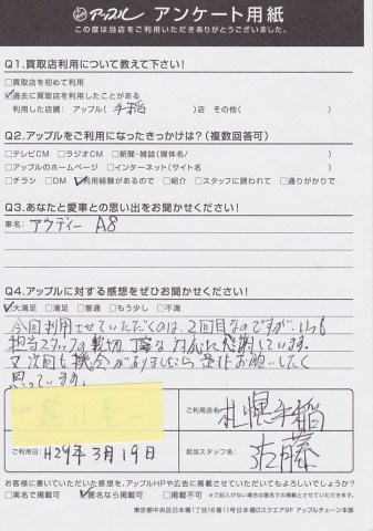 2回目のご利用本当に感謝致します。また、某ディーラー様のご紹介ありがとうございます。お近くを通りの際は是非お寄りください。一緒にコーヒーでも飲みましょう。