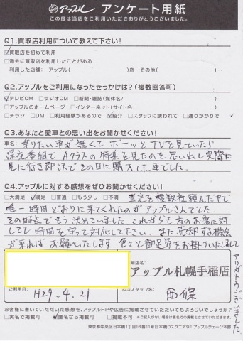 査定を複数社頼んだ中で唯一時間通りに来てくれたのがアップルさんでした。その時点でもう決めていました。これからも他のお客に対しても時間を守って対応してください。また売却する機会が来ればお願い致します。色々と御足労をお掛けいたしましてありがとうございました。