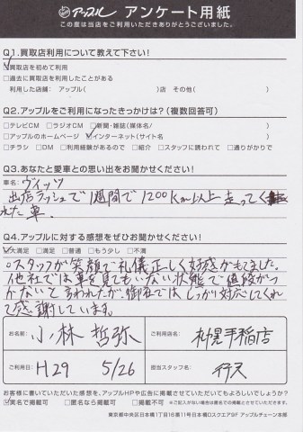 スタッフが笑顔で礼儀正しく好感が持てました。他社では車を見てもいない状態で値段がつかないと言われたが御社ではしっかり対応してくれて感謝しています。
