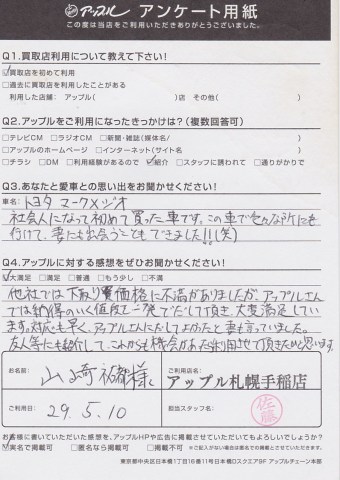他社では下取り価格に不満がありましたが、アップルさんでは納得のいく値段を一発で出して頂き、大変満足しています。対応も早く、アップルさんに出してよかったと妻も言っていました。友人等にも紹介して、これからも機会があったら利用させていただきたいと思います。