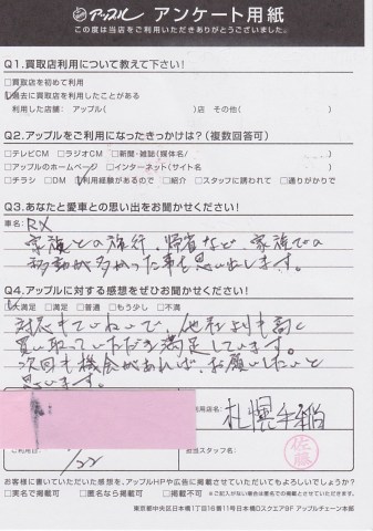 この度は当店をご利用頂きありがとうございます。きれいなお車でしたね。また次の車もきれいに乗ってくださいね。