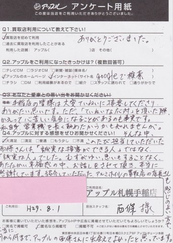 手稲店の皆様は大変ていねいに接客してくださりありがたい思いです。ただ、「ていねいな応対」を頂いた際、かえって心苦しい気分になることがあるのも事実です。私自身、営業職を長く勤めたからかも知れませんが。そんな中、このたび担当していただいた西條さんは「誠実な接客が出来る人」ではなく「誠実な人」でした。むずがゆい思いもすることなく、あたたかい幸福感の中お話をさせて頂き、本当に感謝しています。紹介していただいた、アルミホイルの買取店の店長さんも感じの良い方で本当に何から何まで、アップルの西條さんに出会えてよかったと思っています。