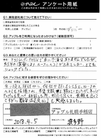 乗換え検討中に何社か話していると、ルーフのヘコミを指摘され、希望金額を諦めていましたが、ネットでアップルを見つけ相談したところ、対応も良くて、金額も良くてさすがに顧客満足度No1を実感しました。
