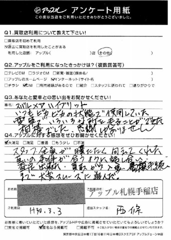 スタッフ全員が暖かく迎えてくれた。互いの条件が合うように話し合い、査定出来た。買取から入金、書類手続きまで大変スムーズに進んだ。