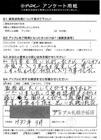 この度は当店をご利用いただきありがとうございます。とても大事にされていたお車でしたね。次に乗っていただく方も大事に乗ってもらえると良いですね。ありがとうございました。