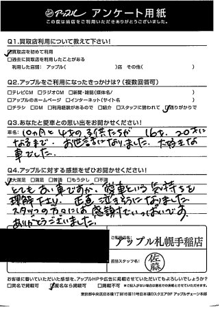 この度は当店をご利用いただきありがとうございます。思い出いっぱいのお車だったんですね。次に乗られる方も大事にされると良いですね。