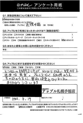 とつぜんの訪問でしたが、わかりやすい説明と迅速な査定。ストレスなく、納得のうえその日のうちに、買取決定となりました。ありがとうございます。
