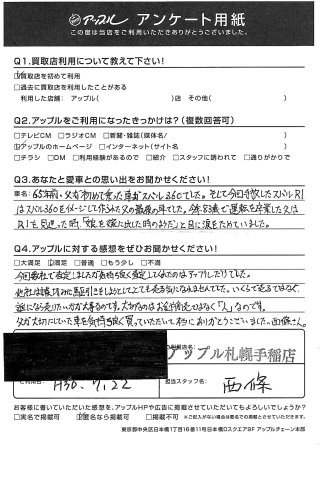 今回数社で査定しましたが気持ちよく査定してくれたのはアップルだけでした。他社は言葉巧みに駆引きをしようとして、とても売る気になりませんでした。いくらで売るではなく、誰になら売りたいかが大事なのです。大切なのはお金や商売ではなく「人」なのです。父が大切にしていた車を気持ちよく買っていただいて本当にありがとうございました。西條さん。