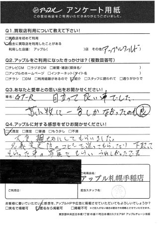 この度は当店をご利用いただきありがとうございます。お引き取り後、お店に戻るまでの注目はもの凄く、私も良い経験をさせて頂きました。ありがとうございました。