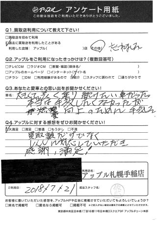 この度は当店をご利用いただきありがとうございます。大事にされていたお車を売却するのがとてもお辛そうで私も胸が苦しくなりました。最終的に喜んでいただけたようで嬉しいです。