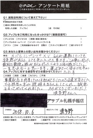 車買取店を利用したのは初めてでしたので正直不安でした。でも担当の方が説明をきちんとしてくれ、誠意をもってやってくれました。ありがとうございました。波多野さんへ