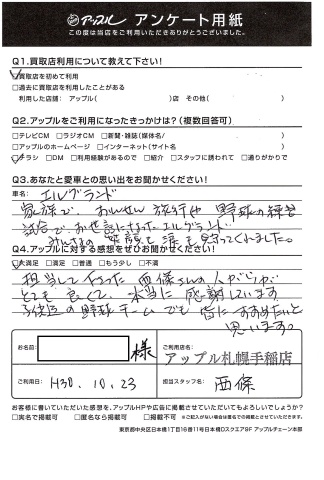 大切にされているお車を譲っていただき、感謝しております。良い車は見つかりましたでしょうか。またのご利用お待ちしております。