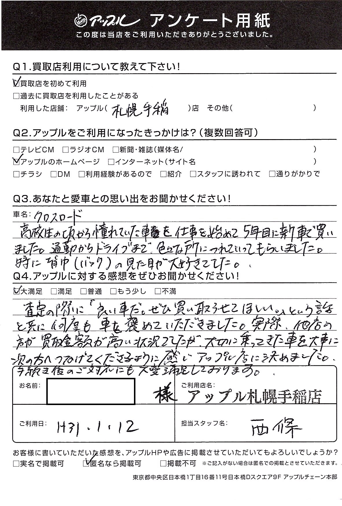 査定の際に「良い車だ。ぜひ買い取らせてほしい。」という話と共に何度も車を褒めていただきました。実際、他店の方が買取金額が高い状況でしたが、大切に乗ってきた車を大事に次の方へつなげてくださるように感じアップル店に決めました。手続き後のご対応にも大変満足しております。
