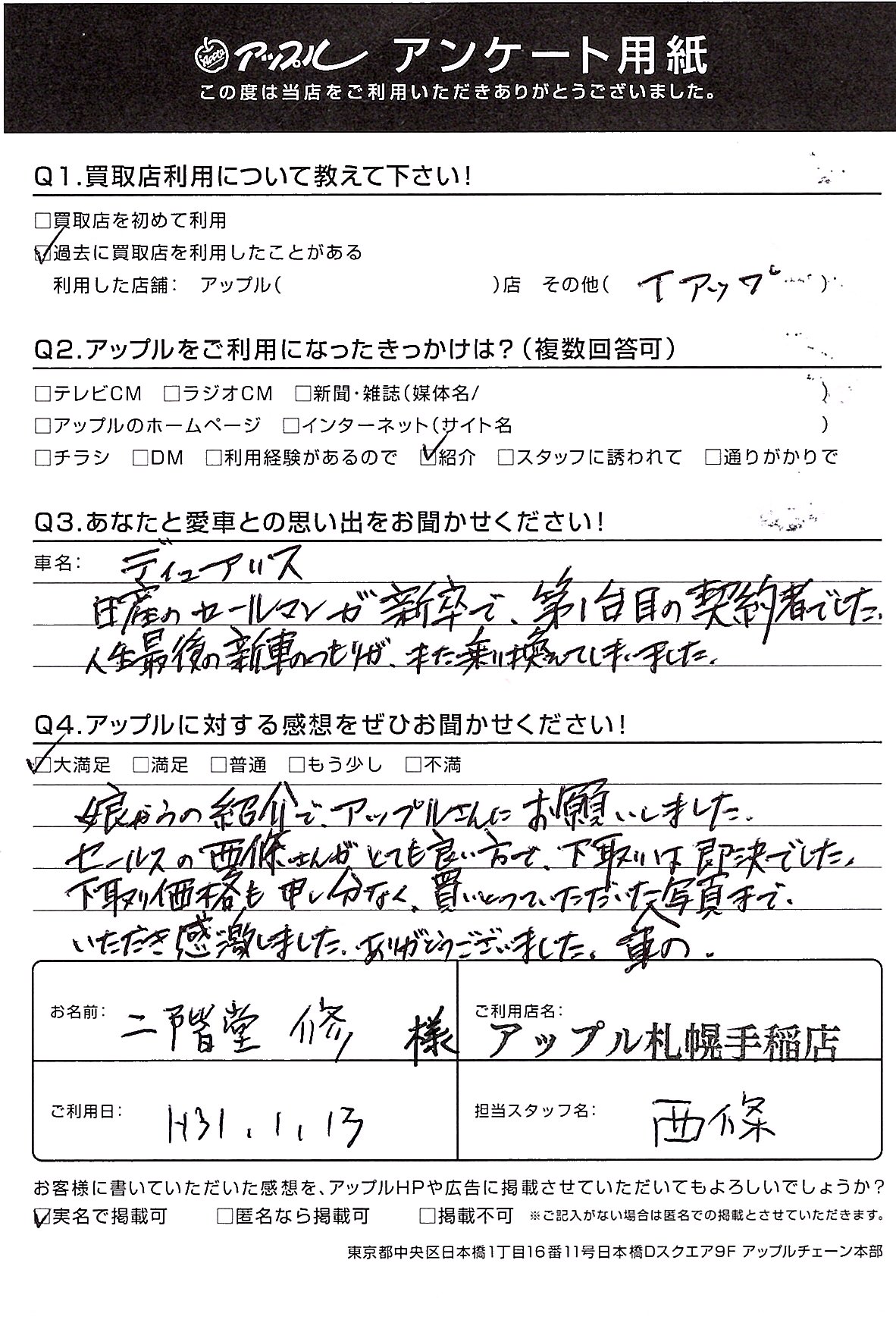 娘からの紹介で、アップルさんにお願いしました。セールスの西條さんがとても良い方で、下取りは即決でした。下取り価格も申し分なく、買いとっていただいた車の写真までいただき感激しました。ありがとうございました。