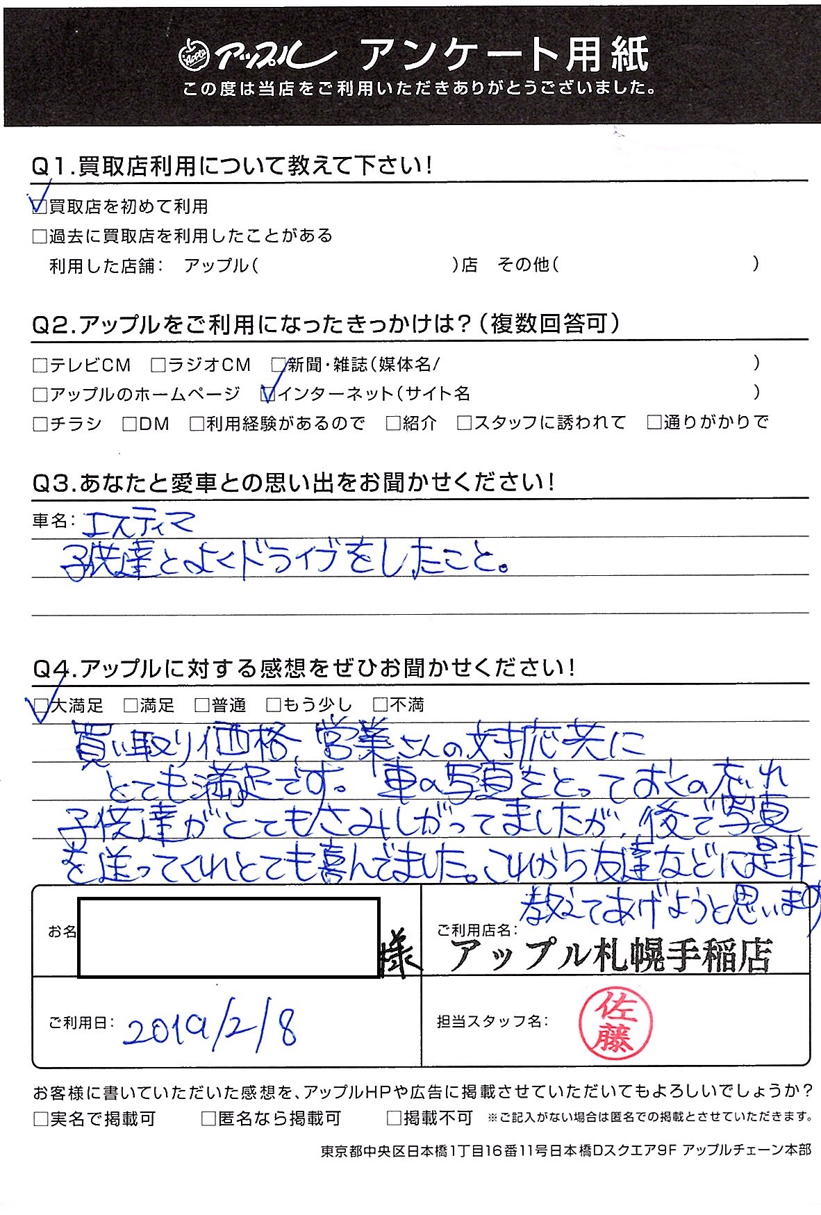 買い取り価格、営業さんの対応共にとても満足です。車の写真をとっておくの忘れ子供たちがとてもさみしがってましたが、後で写真を送ってくれとても喜んでました。これからは友達などに是非教えてあげようと思います。