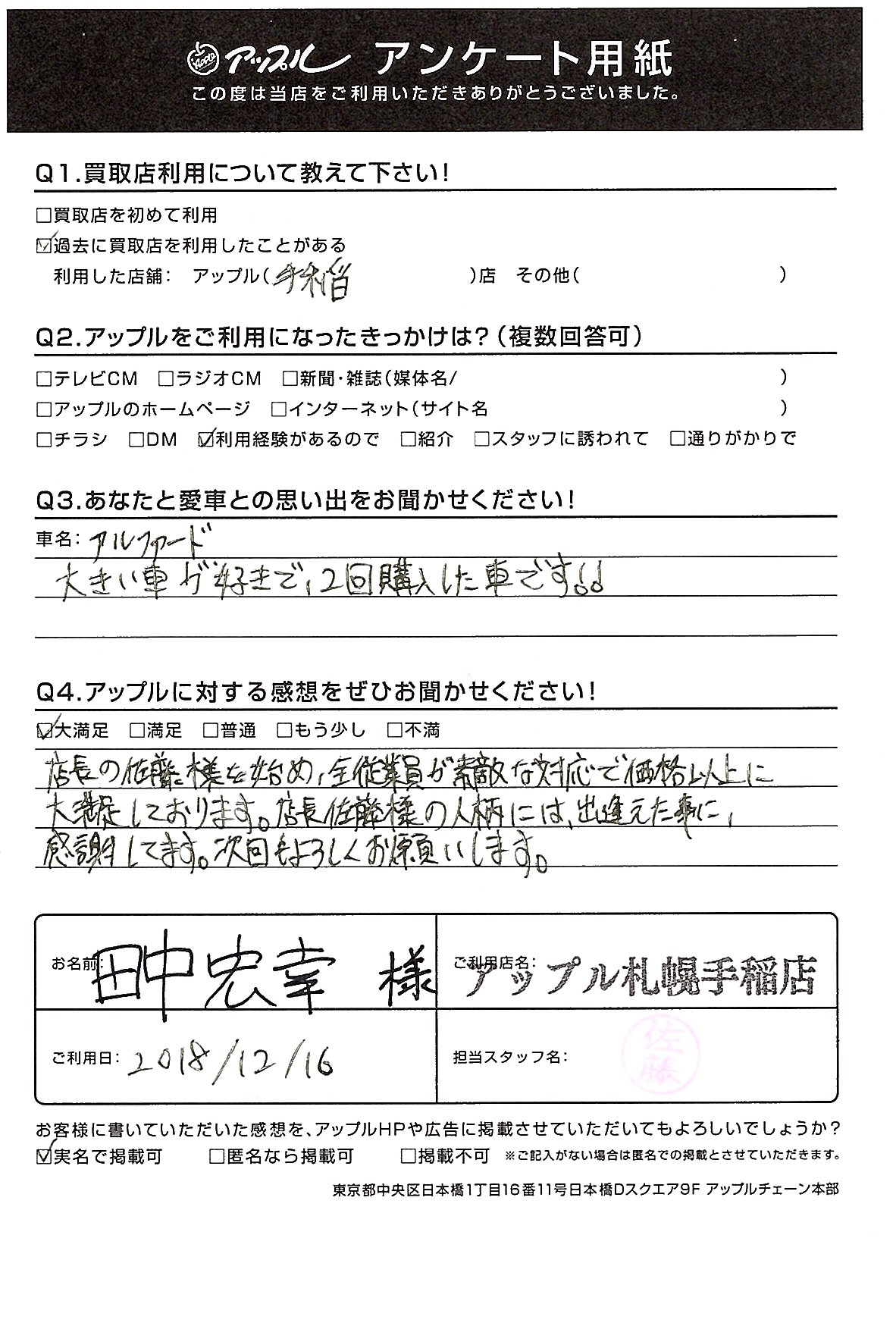 岩見沢 田中様 車名:トヨタ アルファード(H27年1月~のHYBRID含む)