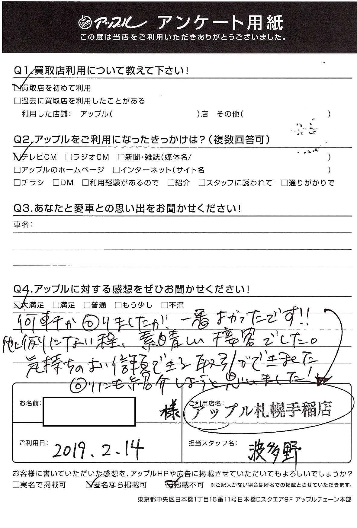 何軒か回りましたが、一番良かったです!!他に例にない程、素晴らしい接客でした。気持ちの良い信頼できる取引が出来ました。周りにも紹介しようと思いました!!