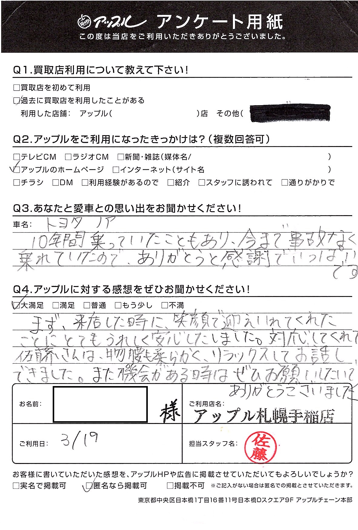 まず、来店した時に笑顔で迎え入れてくれたことにとても嬉しく安心いたしました。対応してくれた佐藤さんは、物腰も柔らかくリラックスしてお話しできました。また機会があるときはぜひお願いしたいです。ありがとうございました。