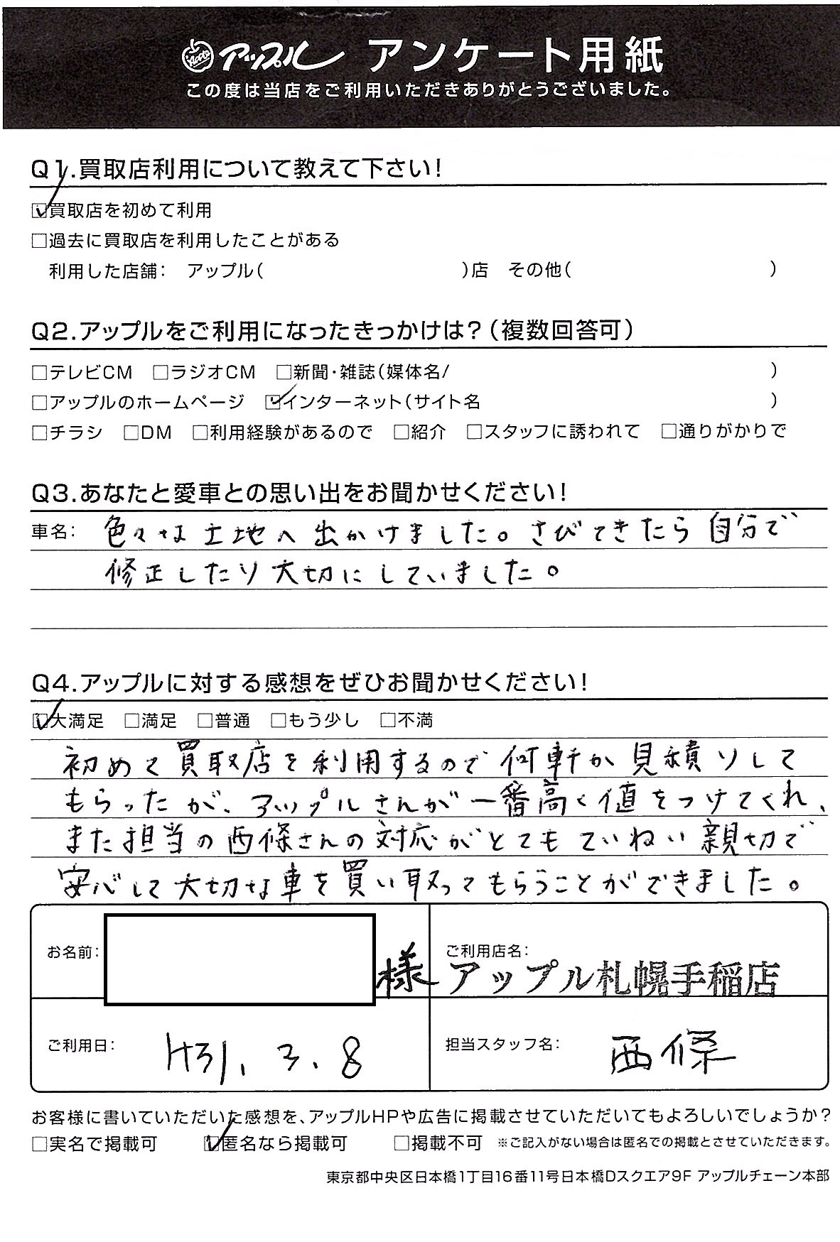初めて買取店を利用するので何軒か見積もりしてもらったがアップルさんが一番高く値をつけてくれ、また担当の西條さんの対応がとてもていねい親切で安心して大切な車を買い取ってもらうことが出来ました。
