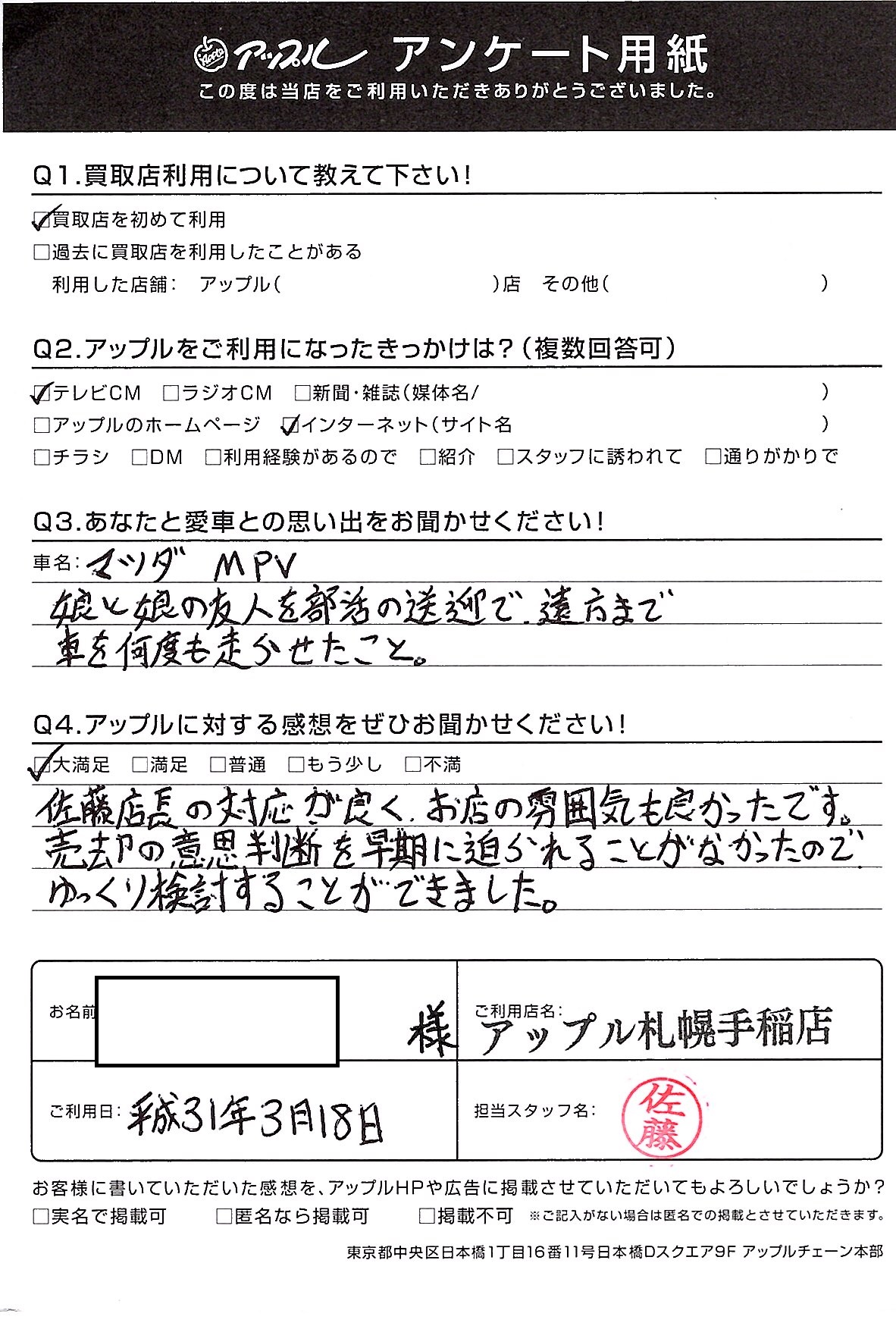 佐藤店長の対応が良く、お店の雰囲気も良かったです。売却の意思判断を早期に迫られることがなかったのでゆっくり検討することが出来ました。