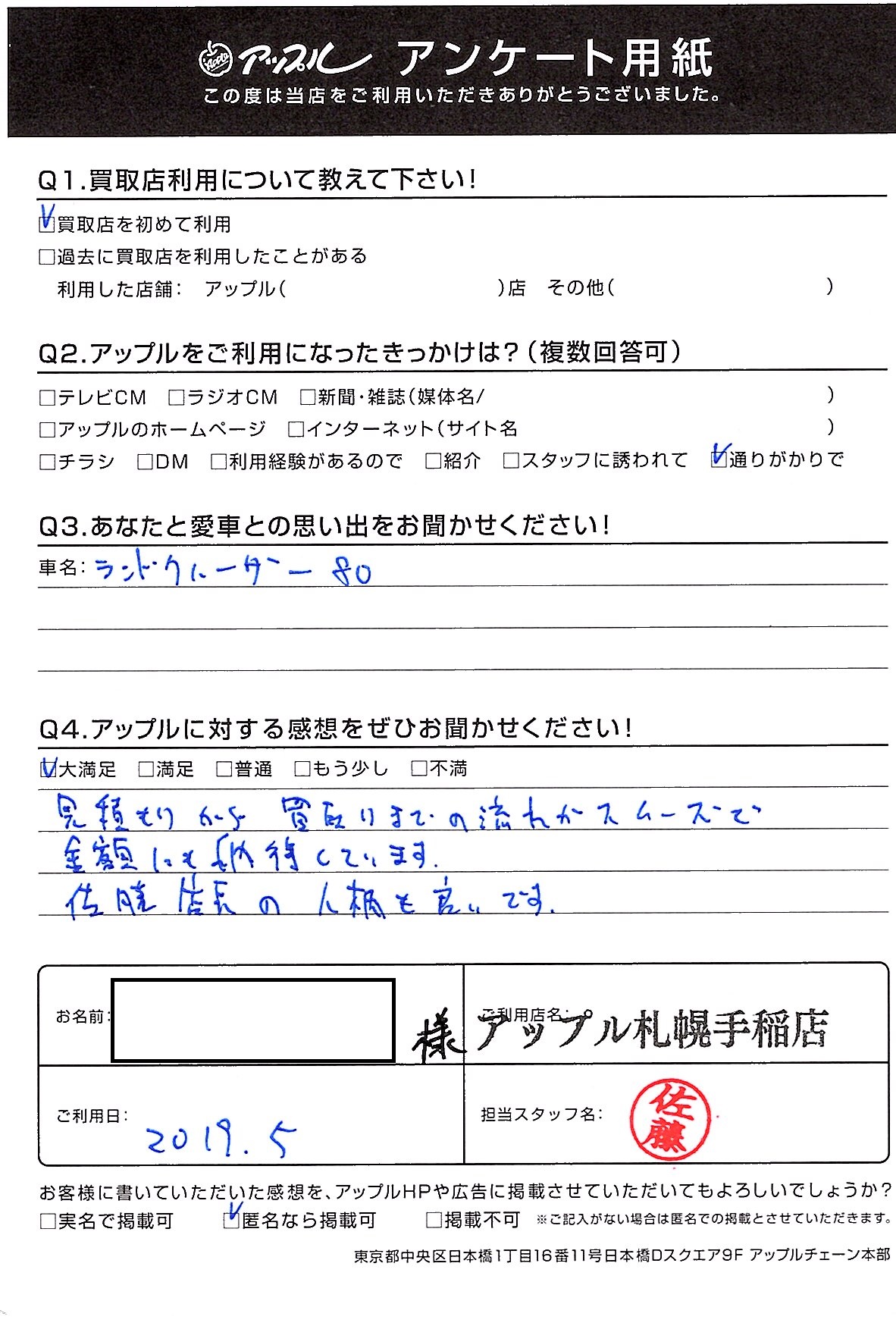 見積もりから買取までの流れがスムーズで金額にも納得しています。佐藤店長の人柄も良いです。