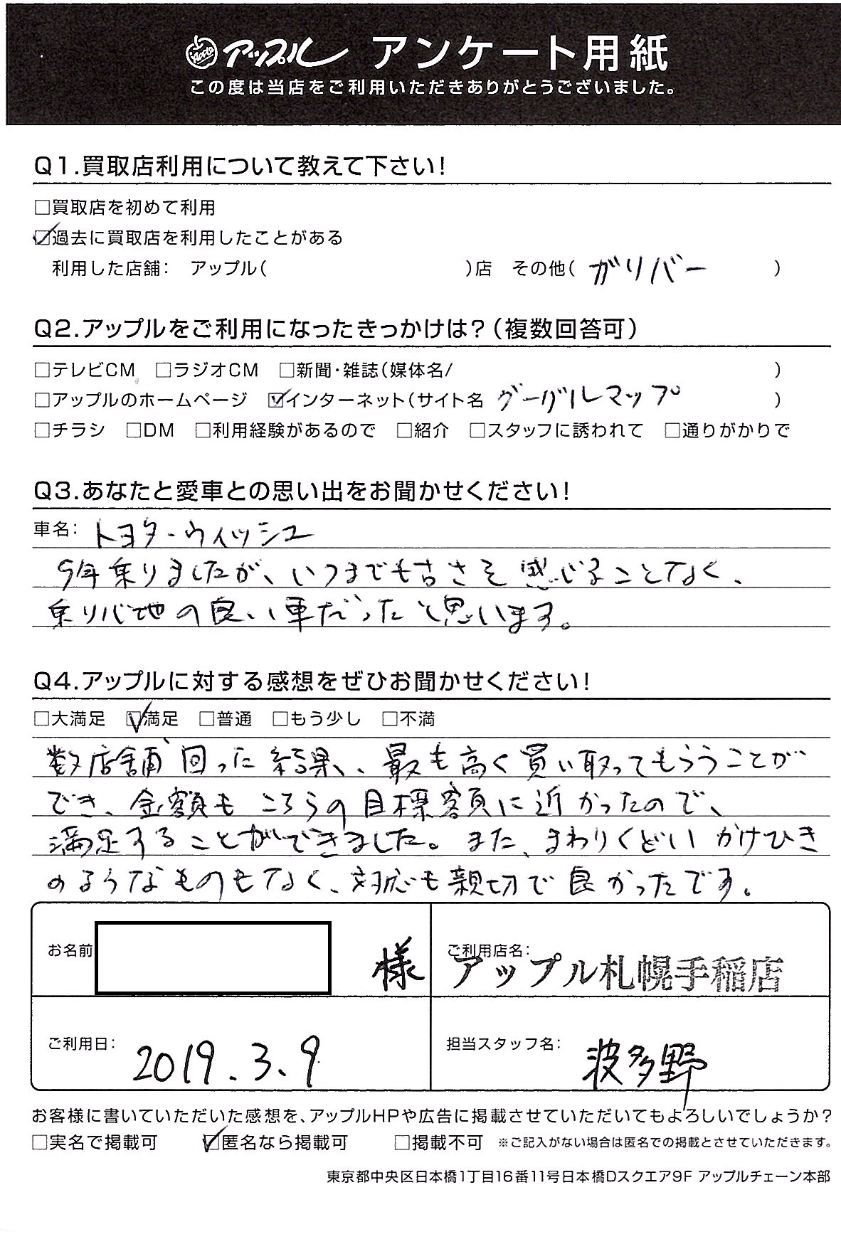 数店舗回った結果、最も高く買い取ってもらうことができ、金額もこちらの目標額に近かったので、満足することが出来ました。また、まわりくどい駆け引きのようなものもなく、対応も親切で良かったです。