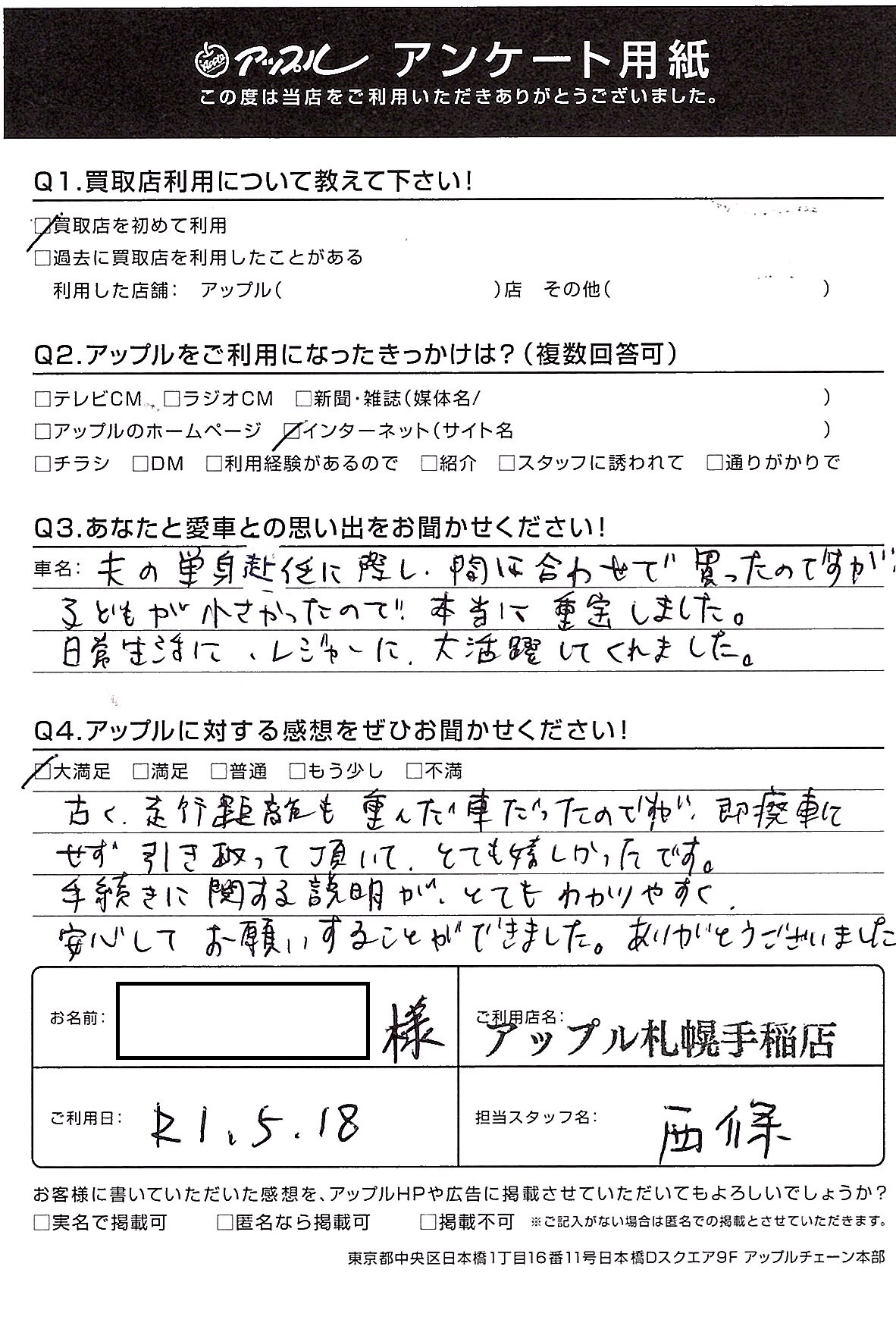 大切にされていたお車を譲って頂いたこと感謝しております。またのご利用を心からお待ちしております。