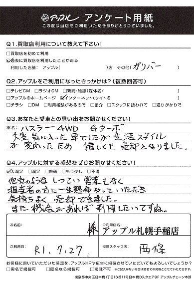 小樽市 K様 車名:スズキ ハスラー