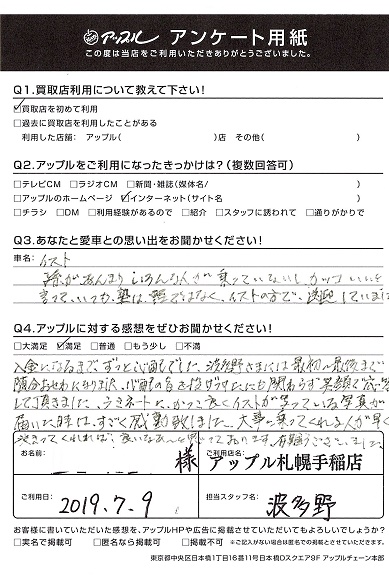 入金になるまで、ずっと心配でした。波多野様には最初~最後まで随分おせわになりました。心配の旨を投げつけたにも関わらず笑顔で応答して頂きました。ラミネートに、かっこ良くイストが写っている写真が届いた時は、すごく感動致しました。大事に乗ってくれる人が早く決まってくれればいいなあ~と思っております。有難うございました。