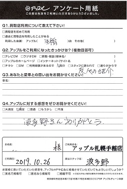 お車のご相談・ 査定だけでもOK! カンタン 入力 30秒 アップルがブランド買取始めました! お電話でも受付中! 受付時間10:00 ~ 18:00 0120-88-1717 お車のご相談・ 査定だけでもOK! カンタン 入力 30秒 アップルがブランド買取始めました! お電話でも受付中! 受付時間10:00 ~ 18:00 0120-88-1717 アップルがブランド買取始めました! お電話でも受付中! 受付時間10:00 ~ 18:00 0120-88-1717 店舗情報 在庫車 スタッフ紹介 ブログ お客様の声 キャンペーン 無料査定 click お客様の声 ご記入日: 2019/10/26 札幌市手稲区 I様 車名:BMW <アップルに対する感想をぜひお聞かせください>波多野さんありがとう。<担当 波多野>こちらこそありがとうございました。是非遊びに来てください。 前へ 次へ お客様の声一覧を見る
