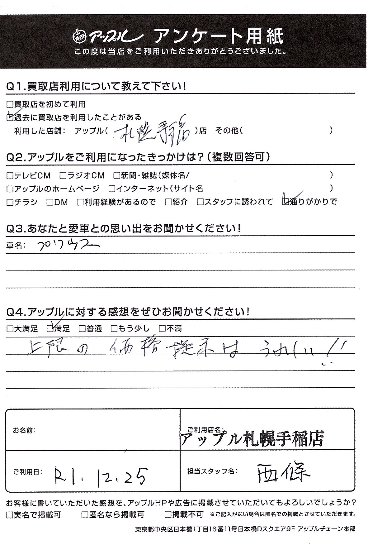 お車のご相談・ 査定だけでもOK! カンタン 入力 30秒 アップルがブランド買取始めました! お電話でも受付中! 受付時間10:00 ~ 18:00 0120-88-1717 お車のご相談・ 査定だけでもOK! カンタン 入力 30秒 アップルがブランド買取始めました! お電話でも受付中! 受付時間10:00 ~ 18:00 0120-88-1717 アップルがブランド買取始めました! お電話でも受付中! 受付時間10:00 ~ 18:00 0120-88-1717 店舗情報 在庫車 スタッフ紹介 ブログ お客様の声 キャンペーン 無料査定 click お客様の声 ご記入日: 2019/12/25 中央区 T様 車名:トヨタ プリウス(2023年3月~のPHVを含む) <アップルに対する感想をぜひお聞かせください>上限の価格提示はうれしい!!担当 西條この度は即決していただき感謝しております。またのご利用お待ちしております。 前へ 次へ お客様の声一覧を見る