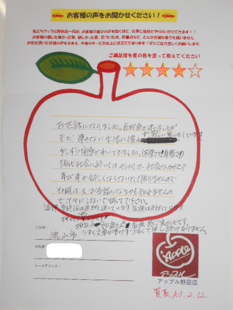 お世話になりました。売却色々迷いましたが未だ車のない生活に慣れず寂しい思いをしてます。少しずつ実感がわいてきました。(不便さと!身軽さ!)現代社会に於いてはやはりカー社会なのかと?再び車が欲しくならないとは限りませんのでその時は又お世話になるかもしてませんのでアテにしないで待っててください。担当の加島さんと店長感じ良かったです。