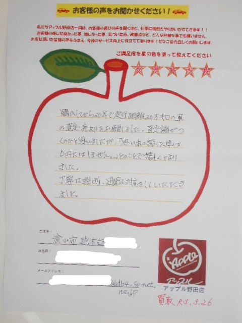 お車のご相談・ 査定だけでもOK! カンタン 入力 30秒 アップルがブランド買取始めました! お電話でも受付中! 受付時間10:00~19:00 04-7128-7217 お車のご相談・ 査定だけでもOK! カンタン 入力 30秒 アップルがブランド買取始めました! お電話でも受付中! 受付時間10:00~19:00 04-7128-7217 アップルがブランド買取始めました! お電話でも受付中! 受付時間10:00~19:00 04-7128-7217 店舗情報 在庫車 スタッフ紹介 ブログ お客様の声 キャンペーン お得 無料査定 click お客様の声 ご記入日: 2021/03/26 千葉県流山市 買取 K・H様 車名:トヨタ マークⅡブリット 評価:★★★★★購入してから20年で走行距離20万キロの車の査定・売却をお願いしました。査定額がつくのかと思いましたが「思い出の詰まった車は0円にはしません」とのことで嬉しくなりました。丁寧な説明、迅速な対応をしていただきました。 前へ 次へ お客様の声一覧を見る