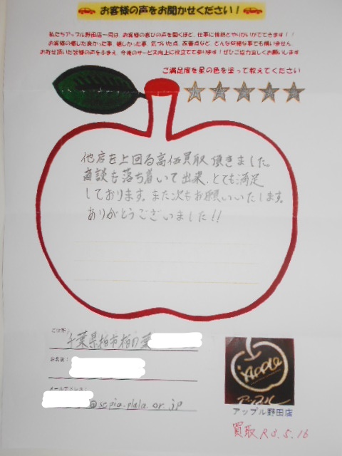 お車のご相談・ 査定だけでもOK! カンタン 入力 30秒 アップルがブランド買取始めました! お電話でも受付中! 受付時間10:00~19:00 04-7128-7217 お車のご相談・ 査定だけでもOK! カンタン 入力 30秒 アップルがブランド買取始めました! お電話でも受付中! 受付時間10:00~19:00 04-7128-7217 アップルがブランド買取始めました! お電話でも受付中! 受付時間10:00~19:00 04-7128-7217 店舗情報 在庫車 スタッフ紹介 ブログ お客様の声 キャンペーン お得 無料査定 click お客様の声 ご記入日: 2021/05/16 千葉県柏市 買取 T・K様 車名:ホンダ N-BOX 評価:★★★★★ 他店を上回る高価買取頂きました。商談も落ち着いて出来とても満足しております。また次もお願いいたします。ありがとうございました。 前へ 次へ お客様の声一覧を見る