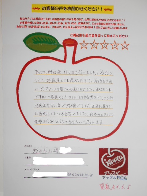 アップル野田店、はじめて伺いました。感想としては、好感度とても高かったです。店内もきれいで、スタッフの皆さんも親切でした。親切さもですが、一番良かったのは、その誠実さでしょうか。生意気な言い方で恐縮ですが、正直に真っすぐに商売をしていると思いました。何かのときには是非またお世話になりたいと思います。