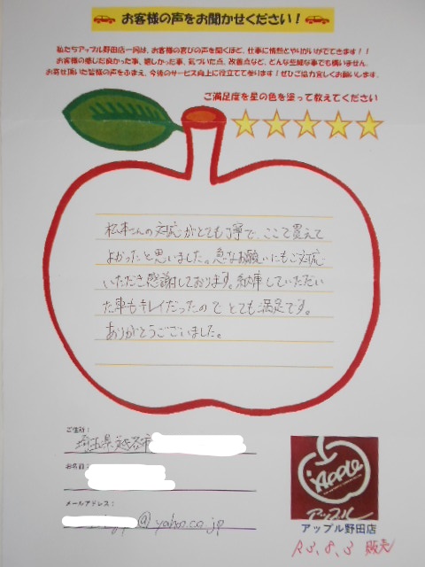 お車のご相談・ 査定だけでもOK! カンタン 入力 30秒 アップルがブランド買取始めました! お電話でも受付中! 受付時間10:00~19:00 04-7128-7217 お車のご相談・ 査定だけでもOK! カンタン 入力 30秒 アップルがブランド買取始めました! お電話でも受付中! 受付時間10:00~19:00 04-7128-7217 アップルがブランド買取始めました! お電話でも受付中! 受付時間10:00~19:00 04-7128-7217 店舗情報 在庫車 スタッフ紹介 ブログ お客様の声 キャンペーン お得 無料査定 click お客様の声 ご記入日: 2021/08/03 埼玉県越谷市 販売 Y・S様 車名:日産 マーチ 評価:★★★★★松本さんの対応がとても丁寧でここで買えてよかったと思いました。急なお願いにもご対応いただき感謝しております。納車していただいた車もキレイだったのでとても満足です。ありがとうございました。 前へ 次へ お客様の声一覧を見る