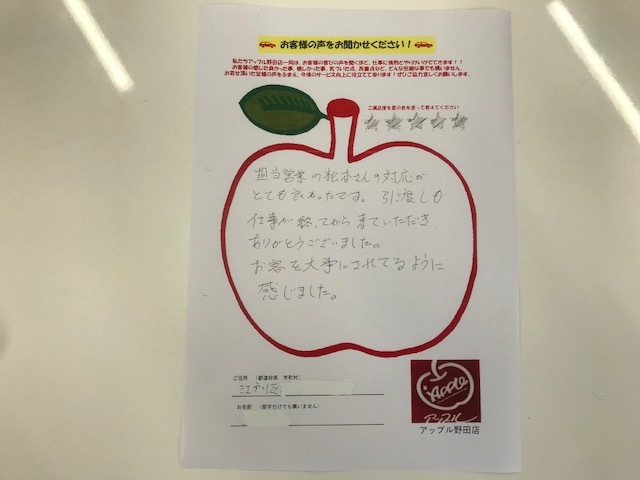 お車のご相談・ 査定だけでもOK! カンタン 入力 30秒 アップルがブランド買取始めました! お電話でも受付中! 受付時間10:00~19:00 04-7128-7217 お車のご相談・ 査定だけでもOK! カンタン 入力 30秒 アップルがブランド買取始めました! お電話でも受付中! 受付時間10:00~19:00 04-7128-7217 アップルがブランド買取始めました! お電話でも受付中! 受付時間10:00~19:00 04-7128-7217 店舗情報 在庫車 スタッフ紹介 ブログ お客様の声 キャンペーン お得 無料査定 click お客様の声 ご記入日: 2018/07/28 N様 担当営業の松本さんの対応が良かったです。引渡しも仕事が終わってから来ていただきありがとうございました。お客を大事にされてるように感じました。 前へ 次へ お客様の声一覧を見る
