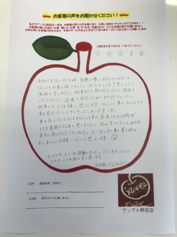 初めてお店に行った時、笑顔で対応してくれたことはとても印象に残りました。対応もとても丁寧でした。価格も良心的で、納車までの期間もマメに連絡をくださりました。迅速に対応してくれたおかげでスムーズに納車でき、とても嬉しく思っています。かっこいい車をGetできて車を見るたびにニヤニヤしてしまいます(笑)車を気に入ったのはもちろんですが店長さんの人柄がとても素敵だなあと思いました。沢山サービスしていただき本当にありがとうございました。次、もしまた車を買う時も松本さんにお願いしたいと思っています。キッズスペースには感動しました。小さい子がいる人にとってはとても助かると思います。お世話になりました!!