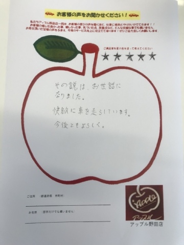 お車のご相談・ 査定だけでもOK! カンタン 入力 30秒 アップルがブランド買取始めました! お電話でも受付中! 受付時間10:00~19:00 04-7128-7217 お車のご相談・ 査定だけでもOK! カンタン 入力 30秒 アップルがブランド買取始めました! お電話でも受付中! 受付時間10:00~19:00 04-7128-7217 アップルがブランド買取始めました! お電話でも受付中! 受付時間10:00~19:00 04-7128-7217 店舗情報 在庫車 スタッフ紹介 ブログ お客様の声 キャンペーン お得 無料査定 click お客様の声 ご記入日: 2018/12/17 M・S様 その節はおせわになりました。快適に車を走らせています。今後ともよろしく。 前へ 次へ お客様の声一覧を見る