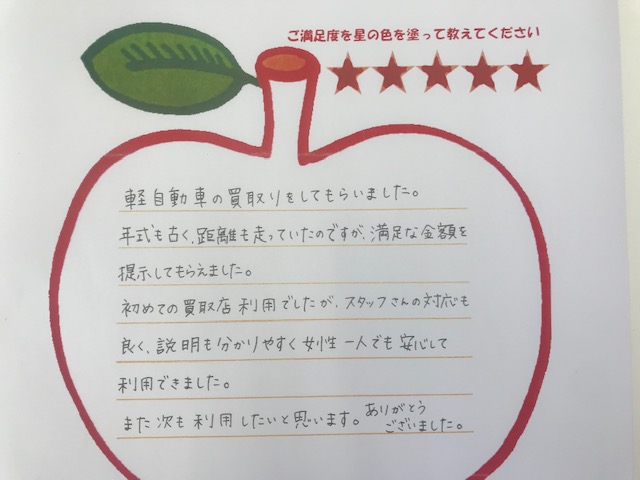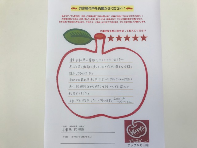 お車のご相談・ 査定だけでもOK! カンタン 入力 30秒 アップルがブランド買取始めました! お電話でも受付中! 受付時間10:00~19:00 04-7128-7217 お車のご相談・ 査定だけでもOK! カンタン 入力 30秒 アップルがブランド買取始めました! お電話でも受付中! 受付時間10:00~19:00 04-7128-7217 アップルがブランド買取始めました! お電話でも受付中! 受付時間10:00~19:00 04-7128-7217 店舗情報 在庫車 スタッフ紹介 ブログ お客様の声 キャンペーン お得 無料査定 click お客様の声 ご記入日: 2019/03/10 千葉県野田市 買取 M様 車名:ダイハツ タント 軽自動車の買取をしてもらいました。年式も古く、距離も走っていたのですが、満足な金額を提示してもらえました。初めての買取店利用でしたが、スタッフさんの対応も良く、説明も分かりやすく女性一人でも安心して利用できました。また次も利用したいと思います。ありがとうございました。 前へ 次へ お客様の声一覧を見る