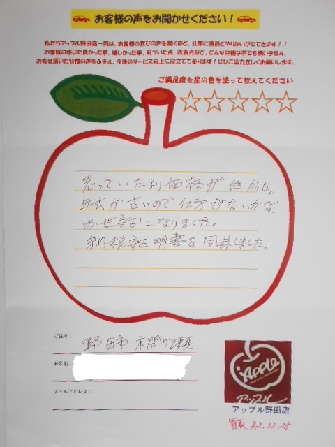 お車のご相談・ 査定だけでもOK! カンタン 入力 30秒 アップルがブランド買取始めました! お電話でも受付中! 受付時間10:00~19:00 04-7128-7217 お車のご相談・ 査定だけでもOK! カンタン 入力 30秒 アップルがブランド買取始めました! お電話でも受付中! 受付時間10:00~19:00 04-7128-7217 アップルがブランド買取始めました! お電話でも受付中! 受付時間10:00~19:00 04-7128-7217 店舗情報 在庫車 スタッフ紹介 ブログ お客様の声 キャンペーン お得 無料査定 click お客様の声 ご記入日: 2020/12/28 千葉県野田市 買取 K・S様 車名:スズキ ワゴンR 思っていたより価格が低かった。年式が古いので仕方がないかな。お世話になりました。 前へ 次へ お客様の声一覧を見る