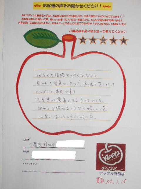 お車のご相談・ 査定だけでもOK! カンタン 入力 30秒 アップルがブランド買取始めました! お電話でも受付中! 受付時間10:00~19:00 04-7128-7217 お車のご相談・ 査定だけでもOK! カンタン 入力 30秒 アップルがブランド買取始めました! お電話でも受付中! 受付時間10:00~19:00 04-7128-7217 アップルがブランド買取始めました! お電話でも受付中! 受付時間10:00~19:00 04-7128-7217 店舗情報 在庫車 スタッフ紹介 ブログ お客様の声 キャンペーン お得 無料査定 click お客様の声 ご記入日: 2021/01/15 千葉県野田市 買取 H・M様 車名:トヨタ bB 他店では値段をつけられないと言われた愛車でしたが高値で買い取っていただけて満足です!長年乗って愛着のあるクルマでした。誰かのお役に立てるなら嬉しいです。この度はありがとうございました。 前へ 次へ お客様の声一覧を見る